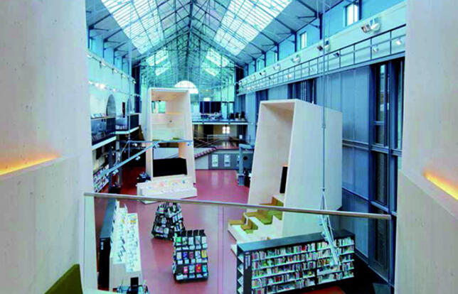 Le jury a récompensé le travail mené par le cabinet Canal Architecture pour transformer les espaces intérieurs de cet ensemble industriel en un lieu accueillant tous les services et les activités d’une bibliothèque moderne. Sa proposition valorise la dimension spectaculaire du bâtiment tout en créant une ambiance intime et accueillante. Sur 5 000 m2, les visiteurs circulent dans des espaces ouverts mais où les différentes activités sont bien identifiées. Dans le hall d’accueil, des gradins géants symbolisent cette intention : impressionnants par leur monumentalité, ils offrent néanmoins un confort de posture qui a rapidement séduit les usagers. Les espaces de convivialité et de rencontres, notamment une salle d’exposition de 175 m2, un auditorium de 195 places et un café ont été rassemblés à l’entrée.