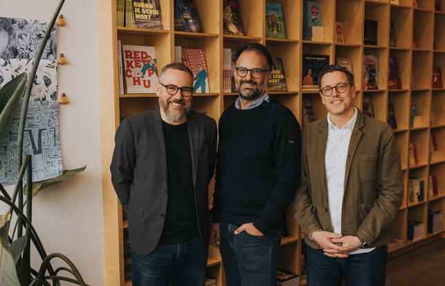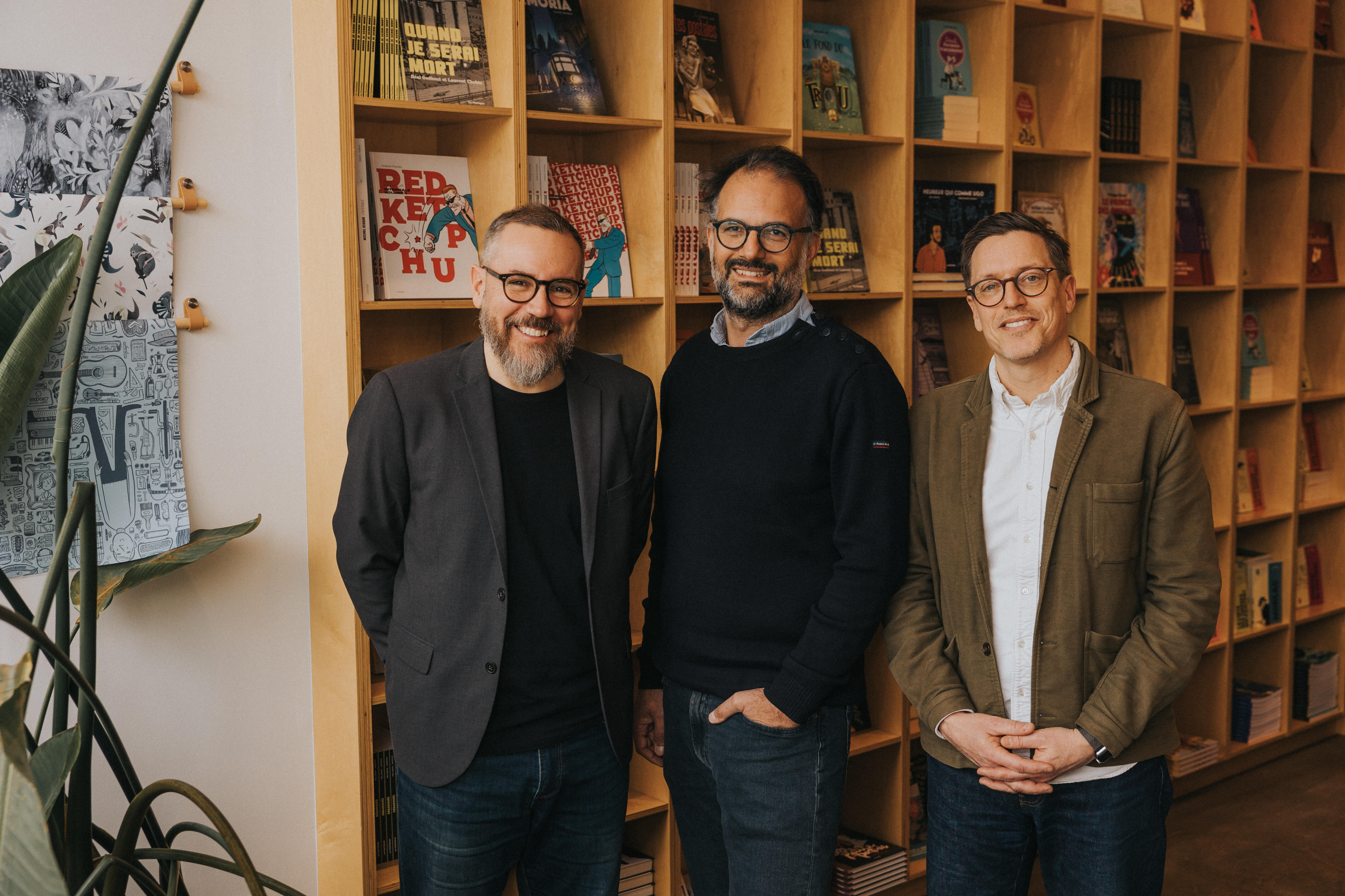 Sylvain Lumbroso, directeur général de Bayard Canada, entouré des cofondateurs des éditions La Pastèque Martin Brault et Frédéric Gauthier - Photo Sara-Maude Ravenelle