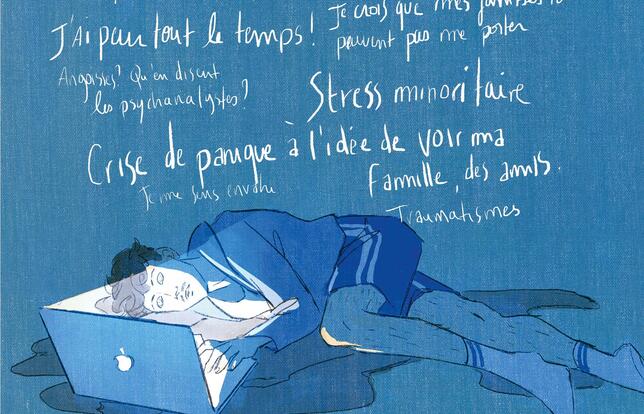 Révélé avec Touchées (son troisième album en solo, chez Payot, en 2019), récompensé à Angoulême pour Toutes les princesses meurent après minuit (Le Lombard, 2022), Quentin Zuttion est un des auteurs de sa génération les plus prolifiques (il sort presque un livre chaque année) et exposés. Mais c'est sans doute cet opus qui va le propulser dans une autre dimension, tant par la force de son propos que la sensibilité de sa mise en scène. Dans un univers bleuté aux jeux de lumière d'une belle subtilité, nimbant son trait presque évanescent d'une atmosphère inquiète, l'auteur s'adresse à lui-même comme s'il s'observait de l'extérieur. Il pointe, il commente, il dénigre, il s'apitoie. Il enfonce encore un peu sous l'eau la tête d'un jeune artiste homosexuel dévoré par son mal-être, et régulièrement tenté de se le faire payer par des comportements autodestructeurs.