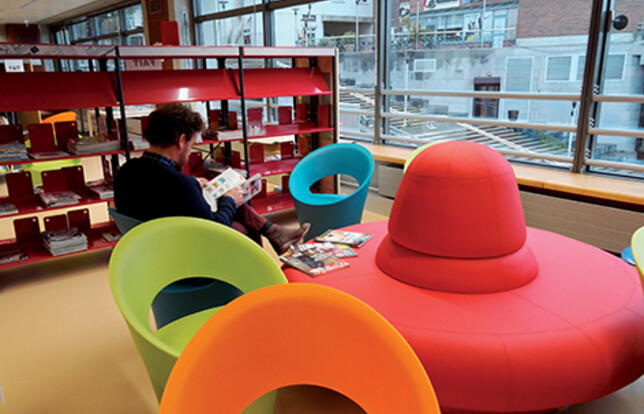 Dans les étages, les collections ont été réorganisées en trois espaces de manière à favoriser une fréquentation intergénérationnelle et différents types d’usage - détente, travail, visite en famille, seul ou en groupe. Les espaces ont été dotés de noms attractifs. "La grande évasion" propose les collections autour des loisirs et du jeu, "Bouillon de culture" est dédié à la formation, l’information et l’actualité, tandis que "Zik et bulles" rassemble l’offre de musique et de BD. Un quatrième espace, "Doudous et Cie", est réservé aux tout-petits. Cette volonté de brasser les publics est venue à l’équipe au cours de son installation provisoire pendant les travaux dans un petit local de 600 m2 dans le centre commercial voisin. "Nous avons trouvé intéressant de voir des personnes âgées et des adolescents se côtoyer pour lire une BD ou le journal", explique Isabelle Jacquelain, directrice de la médiathèque du Canal. Autre effet positif de cette installation temporaire : des habitants ont découvert pour la première fois l’existence de la bibliothèque dont le bâtiment habituel n’est pourtant qu’à deux pas.