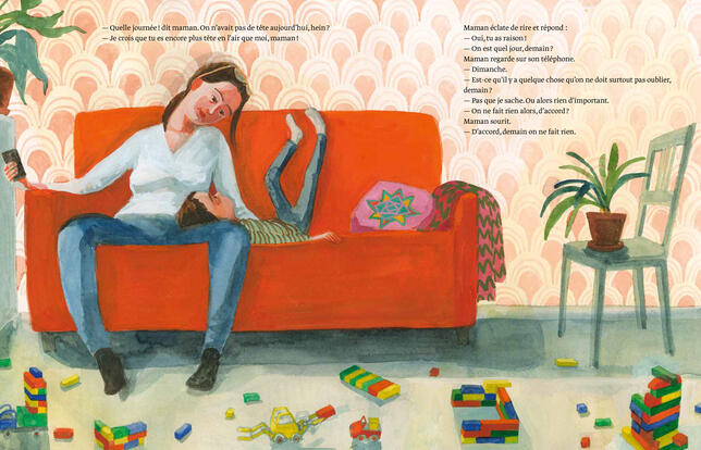 Noa doit aller à l'anniversaire d'Alma, mais il traîne un peu les pieds. Il y aura toute la classe et de plus, il ne joue jamais avec Alma. Ce matin, sa maman le presse comme un citron, lui demande de s'habiller et de se préparer fissa. Il fait ce qu'il peut, le pauvre, mais n'est jamais assez rapide pour la tornade maternelle. Il faut encore aller acheter un cadeau. Ils font le tour des magasins. Un habit ? Non, trop cher. Un jouet, alors ? Oui, mais un diadème. Comme Noa est un peu lunaire, il sème ses affaires un peu partout. Le blouson au magasin d'habits et la casquette près des jouets. Le petit paquet cadeau, lui, a été oublié par Noa sur la banquette du bus. Tant pis, il fera le bonheur de quelqu'un d'autre. La maman enrage, on perd du temps à retourner ainsi sur ses pas ! Finalement, tous deux arriveront à l'heure à l'anniversaire d'Alma. Petit problème, ce n'est pas le bon jour. Un mal pour un bien, cette erreur d'agenda leur permettra finalement de rectifier le tir quant au choix du cadeau... Les mamans pressées en prendront de la graine. Rien ne sert de courir, il faut partir à point, nous rappelle cet album qui connaît bien le rythme des parents à l'opposé de celui, infiniment plus lent, de leurs enfants. À tous les parents pris dans une course effrénée contre la montre, la talentueuse autrice et illustratrice suédoise Sara Lundberg offre une parenthèse enchantée. Pleines de tendresse, ses illustrations font bien percevoir la différence de rythme temporel des petits et des grands.