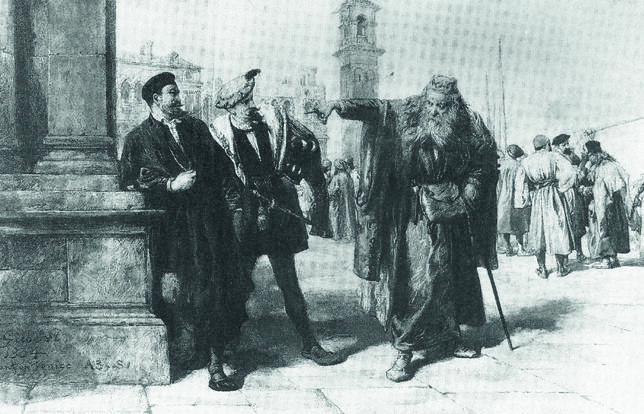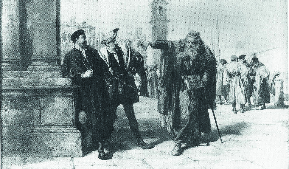 Inspiré par un recueil de contes italiens, Il Pecorone (« Le Simplet »), Shylock est façonné par l'antijudaïsme de son siècle. Le sentiment contre les « juifs perfides » est prégnant dans le contexte élisabéthain. Dans l'imaginaire médiéval déjà, ils ont la réputation d'être des empoisonneurs, des sorciers, des mangeurs d'enfants. En 1290, sous Edouard Ier, ils sont expulsés. En 1609, un nouveau décret chasse hors de l'île les marranes de la péninsule Ibérique qui avaient trouvé refuge en Angleterre et y commerçaient, ces récents convertis considérés comme des crypto-juifs. Quelques années plus tôt, Lopez, un marrane portugais faussement accusé de haute trahison, est condamné à la pendaison et la mise en quartiers... Alors que Le Juif de Malte (1589) de son contemporain Marlowe portraiture un Barabas, « ogre de bande dessinée », d'une avidité bouffonne, le barde de Stratford ne se contente pas de puiser dans l'archétype existant : il brosse, malgré des traits traditionnellement attribués aux coreligionnaires de l'usurier, un personnage plus complexe. Si Shylock prête de l'argent contre intérêts, ce qui est odieux et contraire à la morale évangélique (notons qu'on interdisait aux juifs d'exercer la plupart des métiers, et il ne leur restait que ceux qui étaient prohibés aux chrétiens), Shakespeare lui souffle la fameuse tirade « Un juif n'a-t-il pas des yeux ? », son plaidoyer pro domo au procès où il est confronté à Portia déguisée en juriste... L'humanité en partage (d'où diffère-t-il des autres hommes ?), le respect du cadre juridique (son contrat garantissant le remboursement de sa dette en nature), qui n'est pas plus inique que ce qu'autorise déjà la loi, pour preuve, l'esclavage. Shakespeare instille une lumière trouble.