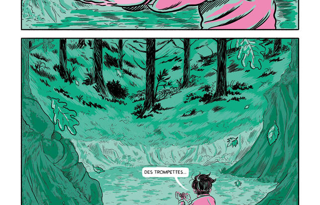 L'Agrume, à qui l'on doit la parution française des albums de Julia Wertz ou la série Dora de l'Argentin Minaverry, publie cette étonnante première bande dessinée de Simon Bournel-Bosson, graphiste et directeur artistique qui a notamment travaillé pour les éditions Kiblind. Entre Twin Peaks et Bambi, Les trompettes de la mort est un conte cauchemardesque où le malaise s'instaure progressivement, par petites touches, par des références glissées çà et là (comme celle à la série télé V avec son héroïne croqueuse de souris). Malgré la nature champêtre dans laquelle se déroule la moitié du récit, l'impression de huis clos étouffant est constante. Le décor aux détails soignés et le dynamisme des planches contrastent avec ce chevreuil presque stylisé, à la bonne bouille un peu ronde comme pour mieux signifier son innocence dans ce monde sans pitié. Le trait clair de Simon Bournel-Bosson, ses habiles alternances de plans et ses couleurs très tranchées fonctionnant par paires (orangé/bleu, mauve/bleu...), renforcent l'étrangeté de l'atmosphère. Plus encore que notre rapport ambivalent à la nature, le fantastique souligne ici la difficulté pour un enfant à s'ajuster au monde qui l'entoure.