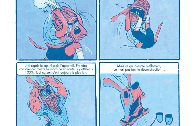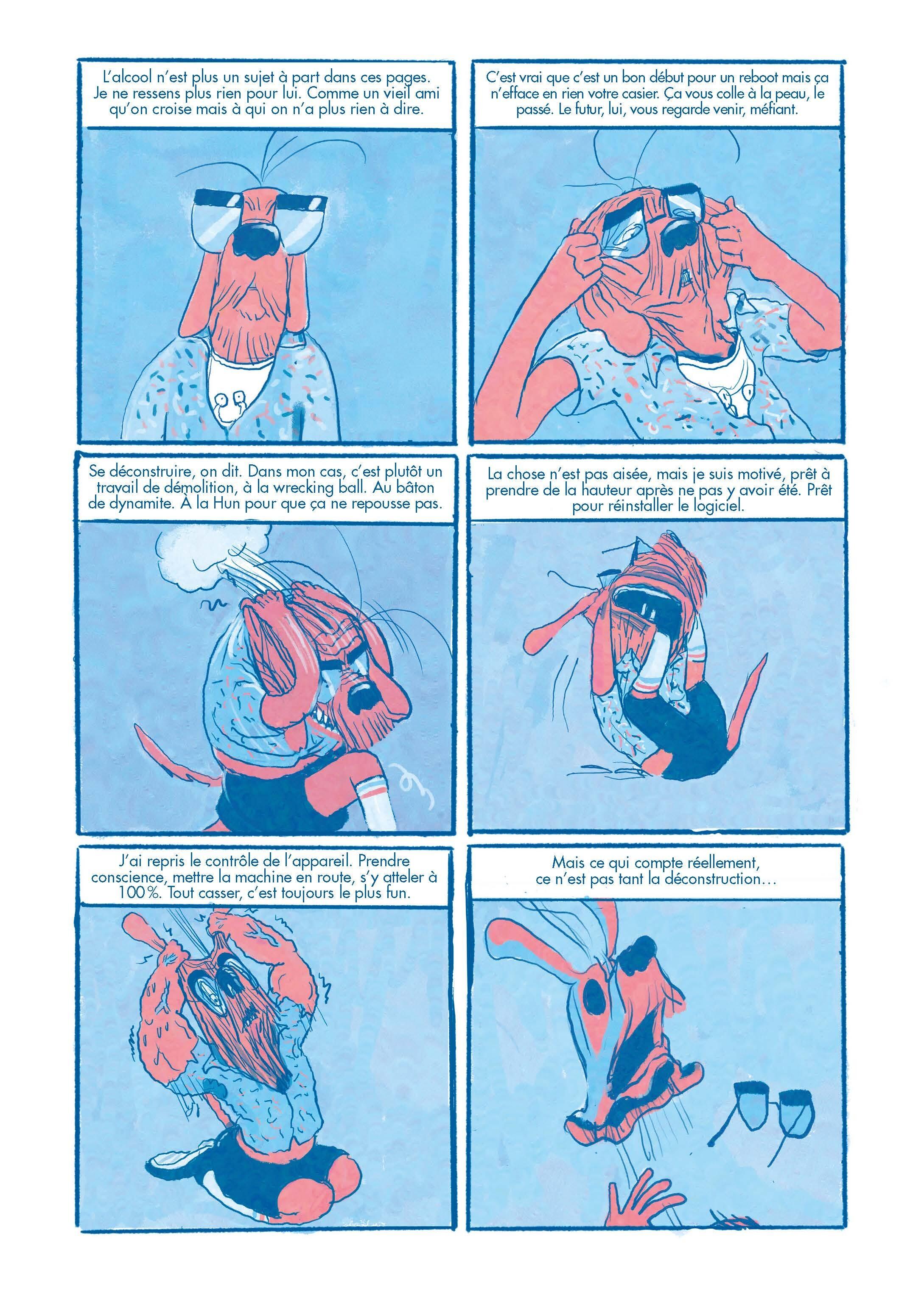 Terreur Graphique y parle en effet sans fard de son alcoolisme et de ses efforts pour en guérir. Dans de courts chapitres aux immuables vignettes carrées- vues en partie sur Instagram-, l'auteur tente de remonter aux sources de son addiction sans jamais chercher d'excuse ni d'absolution. Il s'affranchit de la chronologie pour mieux fouiller dans ses souffrances intimes et dans les représentations sociales de l'alcool, qui en banalisent voire en valorisent la consommation (dans les discours familiaux, dans les films...). C'est là qu'il fait très fort : loin de suivre les traces de trop de BD autobiographiques sur divers syndromes et afflictions, qui se contentent souvent de dérouler les conséquences de ceux-là sur le quotidien, Terreur Graphique propose une introspection en forme de voyage en enfance. Bien sûr, il évoque son acceptation de la dépendance, ses rendez-vous médicaux ou son premier sevrage. Mais là où il bouleverse, c'est quand il explique comment il en est arrivé à vivre ivre, reproduisant le schéma paternel qu'il avait pourtant si fortement rejeté. Son album est en effet comme la lettre qu'il n'a jamais pu envoyer à son géniteur, ivrogne gênant et violent, figure de repoussoir pour le gamin souffrant de troubles de l'attention non diagnostiqués qu'il était, pétri d'angoisses et orphelin précoce de sa mère. Dans une narration bourrée de calembours et de références culturelles, et portée par un trait cartoon sale d'une puissance rare, son journal intime d'alcoolique repenti va bien au-delà des simples « confessions » annoncées en sous-titre : c'est le livre d'un auteur qui dévoile, enfin, les facettes trop longtemps camouflées d'un talent immense.
