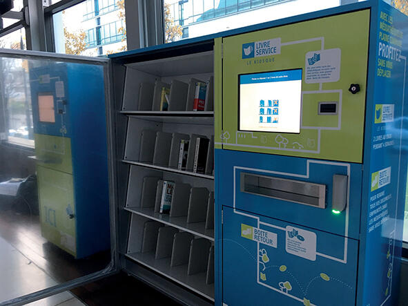 Cette machine pilote, développée avec les fournisseurs Nedap pour les machines et Infor France SAS pour le logiciel de bibliothèque, s’utilise avec une carte de lecteur du réseau des bibliothèques publiques de Plaine Commune. Celle-ci permet de débloquer la porte et de choisir deux livres. L’étagère intelligente, capable de faire son propre inventaire grâce au système RFID, enregistre automatiquement les prêts sur la carte de l’utilisateur. Les personnes qui ne sont pas encore inscrites dans le réseau peuvent s’enregistrer directement sur la borne et obtenir une carte spéciale, utilisable seulement sur le kiosque. Celui-ci est alimenté par une collection autonome, essentiellement de la littérature, qui n’apparaît pas dans le catalogue du réseau des bibliothèques. Les livres empruntés doivent être rendus au kiosque. L’objectif de ce dispositif est d’apporter une offre de base aux usagers dans les lieux qu’ils fréquentent - centres sociaux, maisons de quartier, hall de mairie, locaux associatifs. "Nous travaillons dans deux directions principales : les personnes peu familiarisées avec les bibliothèques et les salariés des entreprises environnantes que nous desservions jusqu’alors par les tournées de bibliobus", détaille Dominique Deschamps, directrice du réseau des bibliothèques de Plaine Commune (Grand Prix Livres Hebdo des Bibliothèques en 2015).