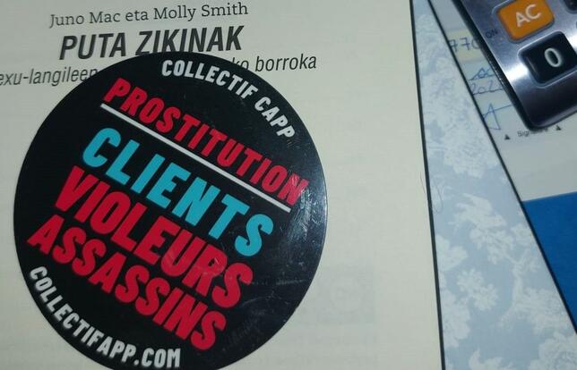 Fin février, le Collectif abolition porno prostitution (Caap) a mené une action militante dans une librairie bayonnaise : il a recouvert de l'autocollant « Prostitution : clients, voleurs, assassins », chaque exemplaire de Puta Zikinak [Sales putes (non traduit en français)] de Juno Mac et Molly Smith, ex-travailleuses du sexe et autrices britanniques. Katakrak Liburuak, la maison basée à Pampelune qui a publié ce texte en basque en 2022, dénonce une attaque inadmissible.