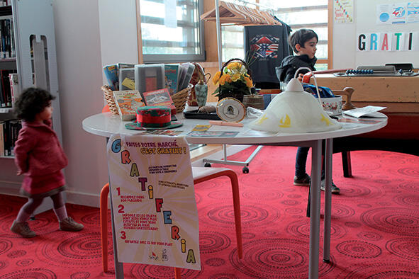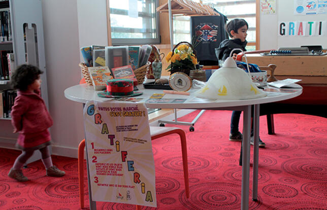 La médiathèque du centre culturel Grain de sel à Séné, commune de 8 700 habitants près de Vannes (56), a inauguré en septembre une "zone de gratuité". Situé au rez-de-chaussée, cet espace rassemble plusieurs services reposant sur l’échange. On y trouve en particulier une "gratiféria". Lancé en 2010 par l’Argentin Ariel Rodríguez, ce concept désigne un "marché gratuit" où chacun peut apporter ses objets et en prendre en retour. L’originalité ici est de proposer sur ce principe un espace permanent. Sur une table dédiée à cet usage, les visiteurs peuvent déposer tout objet pas plus grand qu’une boîte à chaussures, sauf des vêtements, de la nourriture et des appareils électriques. Fin novembre, on y trouvait un abat-jour, un cendrier, des cassettes VHS. La zone de gratuité propose également des bacs à livres, où tout le monde peut faire des dépôts ou se servir, une grainothèque, et un panneau d’échanges des savoirs, inspiré des Réseaux d’échanges réciproques des savoirs , initiative de dimension nationale. Ce panneau a été créé pour satisfaire les usagers désireux de partager une passion ou un savoir-faire. Chacun peut proposer un atelier ou rechercher une compétence particulière. La bibliothèque sert de relais et met à disposition ses locaux. Des ateliers de robotique ont déjà vu le jour sur ce principe. V. H.