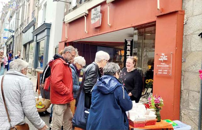 Ce samedi 25 mai dans la matinée, elle montait son étal devant la librairie pour présenter ses livres aux passants, et notamment la nouveauté Chausson, chat de rien de Jacqueline Dérens, qui l'a rejointe l’après-midi pour une séance de dédicaces. Virginie Symaniac a également fait halte au marché de Moëlan-sur-Mer, où elle a aussi donné un atelier d’écriture de poésie, cette fois à la médiathèque-tiers-lieu. Sur la route, elle va à la rencontre de libraires. « Nous allons trouver des manières de travailler ensemble de façon plus pérenne », se projette l’éditrice qui imprime et envoie les 2 000 livres qu’elle fabrique chaque année. Elle n’a qu’elle-même comme vitrine. « Comme personne ne me connaît et ne m’attend, je vais donc vers les gens, je crée une demande. Une fois que les lecteurs me connaissent, ils peuvent me commander les ouvrages », ajoute l’artisane.