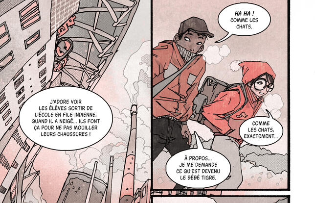 La très talentueuse Yi Yang met tout ce petit monde en scène avec un dynamisme fou et énormément de personnalité. Son trait, sa narration et le rythme sans temps mort du récit empruntent librement au manga et au comics ; son choix de couleurs, radical, dans les gris et rose éteints, fonctionne idéalement pour dépeindre les décors, que ce soit la ville morose ou le détail des différents intérieurs (appartements, école...).