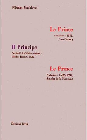 Comporte plusieurs traductions du texte de Machiavel : la première est celle de Gohory parue en 1571, l'une des premières versions françaises, la plus brutale, reproduite ici fidèlement ; la seconde est celle de Blado, l'éditeur romain qui a, le premier, publié «Le prince», en 1532 ; la troisième, celle de La Houssaie (1683), vient en regard de la première, pour mesurer l'écart entre les deux. ©Electre 2019